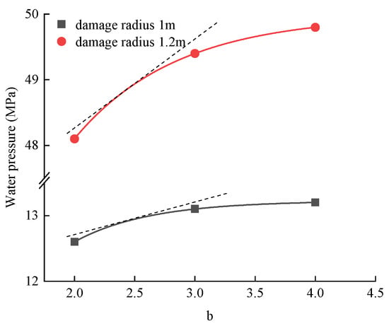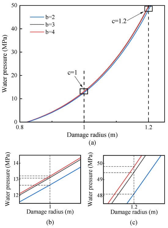 The damage radius under different hydraulic pressure conditions can be obtained from Equation (26), as illustrated in Figure 6. The enlarged views at locations c = 1 and c = 1.2 are shown in Figure 6b and Figure 6c, respectively. As indicated in the figure, within the same influence range, the required hydraulic load exhibits an exponential growth trend as the damage radius of the coal mass increases. Under the same damage radius condition, as the influence range expands, the gradient of hydraulic pressure change shows a slightly increasing trend. This implies that the larger the influence range, the greater the hydraulic pressure needed to cause the same degree of damage. When the damage radius is set at 1 m and the influence ranges exerted by the hydraulic load on the coal are 2 m, 3 m, and 4 m, respectively, the required hydraulic pressures will be 12.6 MPa, 13.1 MPa, and 13.2 MPa. When the damage radius is set at 1.2 m and the influence range is the same, the hydraulic pressures needed are 48.1 MPa, 49.4 MPa, and 49.8 MPa. As depicted in Figure 7, under a fixed damage radius, the greater the zone of influence, the smaller the incremental increase in the required water pressure. Comparing the cases of damage radii of 1 m and 1.2 m laterally, it is obvious that the larger the damage radius, the more pronounced the effect of the influence range on the hydraulic pressure.