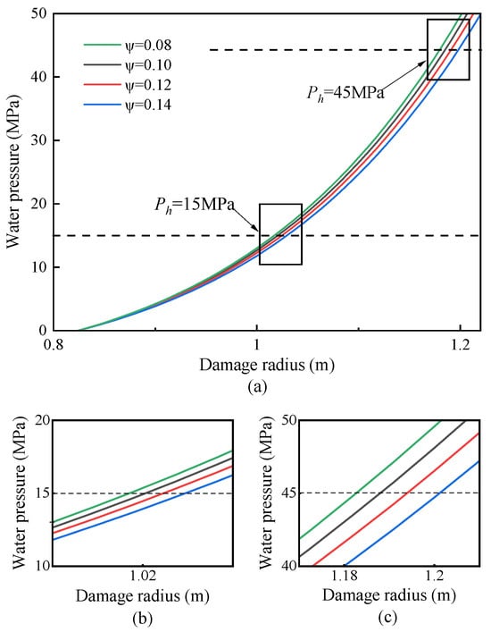 It is generally believed that the porosity of the same coal seam is a fixed value. However, as roadways are excavated, the surrounding rock around the roadways develops cracks and expands under crustal stress, leading to changes in its internal porosity, which is related to coal strain or deformation [,]. When hydraulic fracturing boreholes are arranged perpendicular to the roadway walls of the coal seam, the porosity of the coal at different depths of the boreholes varies slightly. Taking the results of the porosity determination experiments as intervals, the porosity was set as φ = 0.08, 0.10, 0.12, and 0.14. The relationship between the damage radius c and hydraulic water pressure Ph for different porosities φ at an influence range of 2 m is calculated and plotted, and the curves are shown in Figure 8. Among them, Figure 8b and Figure 8c are the enlarged plots at the positions of Ph = 15 MPa and Ph = 45 MPa, respectively.