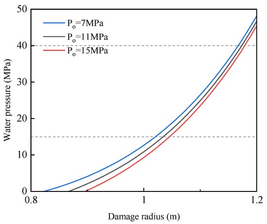 The increase in P0 from 7 MPa to 15 MPa produced a larger damage radius at the same water pressure. Fracturing with a water pressure of 15 MPa in coal seams under far-field crustal stress of 7 MPa, 11 MPa, and 15 MPa resulted in damage radii of 1.045 m, 1.036 m, and 1.018 m, respectively. Damage radii of 1.189 m, 1.123 m, and 1.083 m were obtained from fractures with a water pressure of 40 MPa in coal seams under far-field crustal stresses of 7 MPa, 11 MPa, and 15 MPa.
