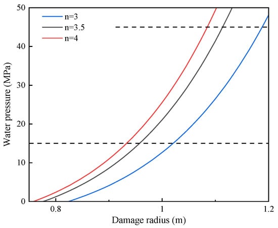 Constant n represents the brittleness of the coal. The greater n, the denser the coal, and the greater the tendency to undergo elastic deformation and accumulate energy under external load. As shown in the figure, the process from n = 3 to 4 resulted in a smaller damage radius at the same water pressure. Fracturing in n = 3, n = 3.5, and n = 4 coals with 15 MPa water pressure resulted in damage radii of 1.045 m, 1.036 m, and 1.018 m, respectively, with 6.0% and 8.2% reductions in damage radius for the n = 3.5 and n = 4 conditions relative to the n = 3 condition. Fracturing in n = 3, n = 3.5, and n = 4 coals with 45 MPa water pressure resulted in damage radii of 1.189 m, 1.123 m, and 1.083 m, respectively, with an increase in damage radius of 6.5% and 10.4% for the n = 3.5 and n = 4 conditions relative to the n = 3 condition. Therefore, compared with the other conditions mentioned above, the influence of different n values on the damage radius is greater, and the higher the water pressure, the greater the influence of n values.