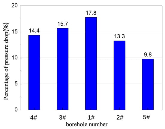 Five gas pressure measurement boreholes were pre-positioned in the hydraulic fracturing test area with spacing of 0.5 m, 1.0 m, 1.5 m, 2.0 m, and 2.5 m, respectively. Hydraulic fracturing was performed at a hydraulic fracturing borehole after the pressure measured in the boreholes stabilized. During the test, the water pressure was set to 5 MPa, and then increased to 10 MPa after confirmation of sealing, stabilizing for 5 minutes. If there is no leakage from the surrounding boreholes, the pressure will gradually increase to 4 MPa for each layer and 2 min for each layer, until the surrounding boreholes return water steadily, with a final extreme water pressure of 35.2 MPa. The ultimate purpose of the hydraulic fracturing is to establish a smoother gas seepage network, improve the permeability of the coal seam, and enhance the regional gas extraction effect. Therefore, borehole gas pressure is an important evaluation index for evaluating hydraulic fracturing damage. The pressure gauges were installed in the gas pressure measurement boreholes to monitor and record the pressure status of the pressure measurement point after hydraulic penetration enhancement. The pressures at each pressure measurement point after the implementation of hydraulic penetration enhancement are shown in Figure 11. The gas pressure decrease ratio of the pressure measurement boreholes is shown in Figure 12. After comprehensively analyzing the proportion of gas pressure decrease after 70 days of pumping in the permeability enhancement area, basically, the proportion of gas pressure decrease decreases with the increase in the distance from the borehole of the hydraulic fracturing. Within this, the biggest decrease ratio is 17.8% in borehole #3. It is considered that the decrease in gas pressure by more than 15% is the critical condition for the determination of the damage impact radius. Under the condition of hydraulic pressure of 35.2 MPa, the limit value of the coal damage radius is 1.5 m. The data obtained from the field practice are the same as the limit value of the coal damage radius calculated theoretically under the same condition, which further verifies the correctness of the theoretical analytical formula obtained.