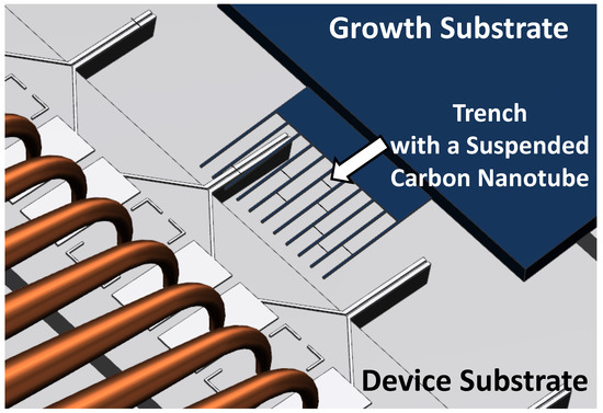 The mechanical dry transfer method of placing carbon nanotubes onto substrates is known to be very clean and therefore results in exceptional device performance. With this type of production process, a distinction can be made between deterministic and non-deterministic placement. With the non-deterministic placement, as reported in [1], carbon nanotubes are scattered randomly over a device substrate. With this method, a very high number of transfers per hour (TPH) can be achieved, but there is no control over the position and orientation of the individual carbon nanotubes. The deterministic mechanical dry transfer manufacturing technique of carbon nanotube devices, on the other hand, utilizes a growth substrate as a carbon nanotube donor to integrate those into a device substrate. The growth substrate has cantilever pairs that form trenches in which a carbon nanotube can be suspended. In [2,3,4,5,6,7,8,9], nanotubes are suspended on such cantilever pairs and are transferred to the device substrate by mechanically breaking them off their support structure. Van der Waals forces guarantee adhesion to the device electrodes. This procedure is schematically depicted in Figure 1. As, however, each single carbon nanotube has to be transferred individually, the achievable production rate is a severe disadvantage. Moreover, as it is necessary to use a motion system for the positioning of carbon nanotubes, travel distances and ranges need to be considered as well.