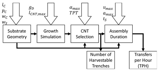 The geometry of a substrate has a significant impact on the overall process efficiency. In addition to the growth parameters, the geometry of the part where the nanotubes are suspended on the substrate dictates the density of harvestable tubes. Hence, the achievable productivity is mainly characterized by these features besides the growth process requirements. Therefore, the process scheme shown in Figure 2 is carried out. A simple simulation of nanotube growth is introduced which considers the cantilever geometries and the growth density of the CVD process. The output of this simulation yields a list of the coordinates of each transferable nanotube. Experimentally grown carbon nanotube substrates validate the proportion of harvestable tubes determined by simulations and the parameters used. The resulting tube list serves, together with the substrate geometry and trajectory parameters of the manipulator, as input for a consecutive time study. The final result is a transfer rate in transfers per hour (TPH) for a given substrate geometry that is achievable with a manipulator’s positioning performance. Furthermore, hints about the replacement rate of the growth substrate are given by the number of transferable trenches.