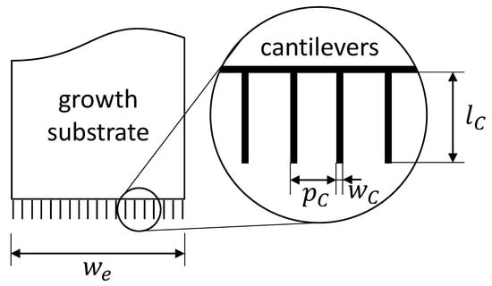 The first step that is required for the growth simulation is the substrate geometry. The simulation only considers a two-dimensional substrate geometry in order to keep the level of complexity low. The input parameters for the creation of the substrate geometry are the length and width of the cantilevers and their pitch as shown in Figure 3. With these parameters given and additional knowledge of the total substrate edge width , sufficient information is given to create the desired substrate. As shown in Figure 3, the resulting number of cantilevers for carbon nanotube growth can be calculated as