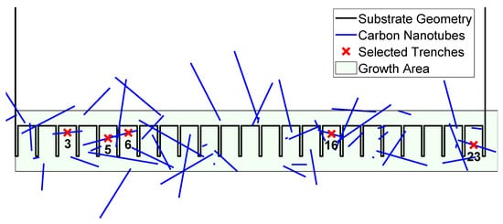 In Figure 4, the trenches chosen for transfer are indicated with a red “x”. It is the outcome of a filter criterion of one carbon nanotube per trench with a maximum relative angle . The resulting list of tubes contains an address table of all trenches to be transferred.