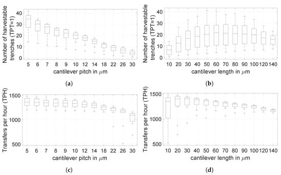 Conclusions from Figure 5a,c show that substrate geometries with narrow cantilevers are preferable. The overall productivity is higher since substrates with such a cantilever geometry offer a higher trench density. This leads to a higher number of harvestable trenches while at the same time the travel distance is shortened. In contrast, and as it can be seen in Figure 5b,d, the cantilever length is limited to the lower and upper end. Short cantilevers cannot suspend as many carbon nanotubes and long cantilevers suspend too many carbon nanotubes. Hence, the optimum cantilever length lies somewhere in between and depends on and the growth parameters chosen.
