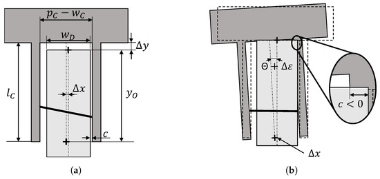 Geometries for the growth substrate in dark gray and the device in light gray. A carbon nanotube, depicted between growth substrate cantilevers in black is transferred to the device by moving perpendicular to the image plane. The offset is shown by the magnitudes of , and . (a) The existing clearance c depending on substrate geometries, overlap and position errors and . (b) Negative example with collision of substrates. The alignment error and the overlap are too large to avoid collision, respectively.