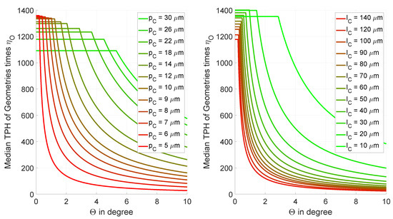 As it can be seen from Equation (6), is also a function of and the cantilever length . Since the different geometry affects productivity (TPH) and the overlap factor alike, the cantilever geometries need to by chosen according to in Figure 8 for the desired overlap to reach maximum productivity.