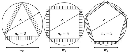 Different substrate geometries with polygonal shapes and the same circumcircle diameter d characterized by the number of edges . The width of each edge and the circumcircle diameter d determine their size.