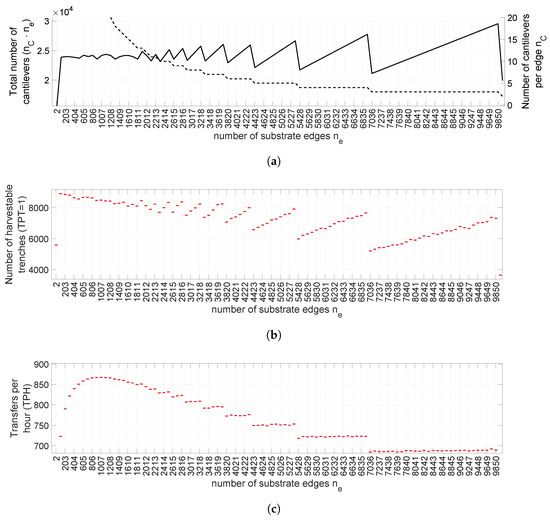 According to Equation (10), the number of cantilevers per edge scale linearly with the circumcircle diameter d. Hence, the number of harvestable trenches also scales with this diameter, since the nanotube distribution is uniform. This allows one to approximate the average number of harvestable trenches for one edge and to assume that each substrate edge has a similar number. This effectively eliminates the time-consuming simulation of growth and selection for each individual edge.