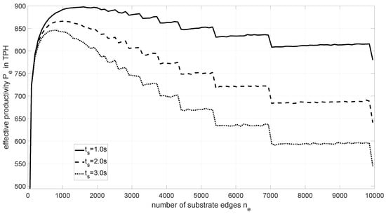 The effective productivity over the number of substrate edges for different settling times of the rotation axis.