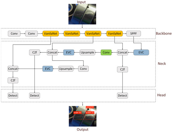 Bearings, vulnerable to damage, exhibit many defect types that complicate detection. The YOLO8 model, despite its broad applicability, faces difficulties in detecting the nuanced and complex characteristics of bearing defects. This work introduces an advanced detection model, enhancing defect identification capabilities beyond the constraints of YOLOv8. This model, enriched with precise optimization strategies and sophisticated algorithms, significantly improves detection accuracy and operational efficiency. Using deep learning has facilitated identifying bearing defects in industrial inspection, enhancing production efficiency and superior quality. This technological advancement has a direct impact on the production process. Based on this, this research aims to make innovative improvements to the YOLOv8 model to enhance its ability to identify bearing defects in complex environments. For ease of identification, it was denoted as YOLOv8-LMG. The YOLOv8 model had low accuracy and missed minor defects, especially in samples with complex backgrounds. Therefore, this work will analyze these problems and present the corresponding solutions. VanillaNet, a lightweight and efficient network structure, is introduced to replace the original YOLOv8 backbone network to improve the ability of the model to extract bearing defect features. Meanwhile, to adapt to the characteristics of the bearing defect dataset, the Lion optimizer developed by Google was introduced in this research. Through its advanced adaptive learning rate adjustment mechanism, the training process of the model was further accelerated, and the recognition accuracy was improved. A centralized feature pyramid network EVC (CFP-EVC) module has been added to improve the ability of the model to detect bearing defects. This module enhances the detection performance of the mold by effectively fusing and centrally processing features. The performance is more significant when dealing with defects with large size changes, occlusion, and complex backgrounds. In terms of loss function, the shape-IOU loss function was proposed in this research to replace the traditional IOU loss function to more accurately evaluate the ability of the model to recognize the shape of bearing defects, thereby improving the overall detection accuracy. The improved model structure is shown in Figure 2.