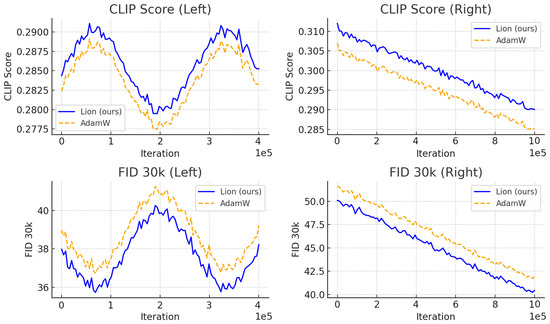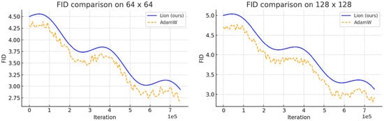 Figure 3 shows that the Lion optimizer exhibits superior quality and quicker convergence regarding Fréchet inception distance (FID) scores across image generation tasks at resolutions of 64 × 64 and 128 × 128. The prowess of the Lion optimizer becomes increasingly evident in higher-resolution tasks, signifying its robustness in managing more intricate challenges. For instance, in the generation of 128 × 128 images, as the iterations progress, there is a noticeable decline in FID scores for the Lion optimizer, indicating an enhanced quality of image generation within the same number of steps compared to the AdamW optimizer. This efficiency gain is crucial for high-resolution image tasks, which typically demand more computational resources and time. Hence, the characteristics demonstrated by the Lion optimizer could be significantly beneficial for improving the training efficiency of large-scale image generation models.