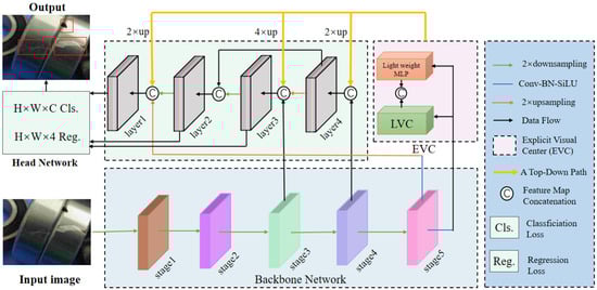 The given image displays a neural network object detection architecture that starts with an input image processed through a backbone network with multiple stages (stage 1 to stage 5) for feature extraction. The head network follows, employing upsampling and concatenation to integrate multi-scale features for object classification and localization. Specialized components, such as lightweight MLP, LVC, and EVC modules enhance network contextual understanding and focus on informative image regions. The CFP-EVC module aims to overcome this problem by explicitly centralizing feature conditioning globally, thereby optimizing the use of feature pyramids in target detection. It captures global remote dependencies through a spatially explicit vision center scheme that uses a lightweight multi-layer perceptron (MLP). In addition, the CFP-EVC module utilizes a learnable visual center mechanism in parallel that is specifically targeted to capture local corner regions of the input image, thus ensuring that the model takes full advantage of all critical information in the image.