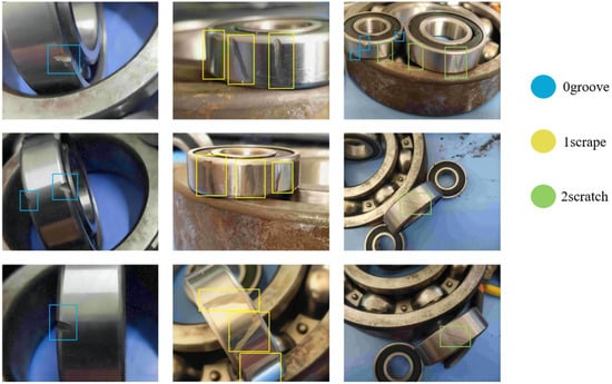 Considering the diversity in and uncertainty of bearing defects, this dataset includes a variety of defect types, including groove defects, scratch defects, and scrape defects. The types of defects are shown in Figure 8, where 0 represents “groove”, 1 represents “scrape”, and 2 represents “scratch”. These defects have different effects on the performance of bearings, so it is particularly critical to carry out accurate detection and classification in practical applications. At the same time, the diversity of defect features in the dataset, such as shape, size, and location, put forward high generalization ability and robustness requirements for the flaw detection algorithm to adapt to the wide range of defect variation in the real scene.