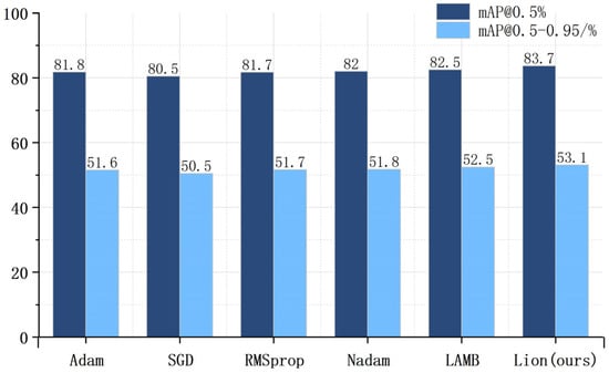 This work compares the Google Lion optimizer with other state-of-the-art optimizers, such as Adam, SGD, etc. The comparison chart is shown in Figure 9. The Lion optimizer scored 83.7% on mAP@0.5, 1.9 percentage points higher than the standard Adam optimizer. More significantly, the Lion optimizer scored 53.1% in mAP@0.5–0.95, 1.5 percentage points higher than Adam, 2.6 percentage points higher than SGD, and 1.4 percentage points higher than RMSprop. It was 1.3 percentage points higher than Nadam and 0.6 percentage points higher than LAMB.