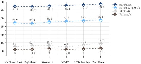 As can be seen from Figure 10, VanillaNet showed excellent results in key performance indicators when comparing different backbone network models. Specifically, in the mAP@0.5 evaluation, VanillaNet led with an accuracy of 85.9%, which is 4.1 percentage points higher than the baseline model YOLOv8 at 81.8%. In the more rigorous mAP@0.5–0.95 evaluation, VanillaNet outperformed the other models with an average accuracy of 56.3%, 4.7 percentage points higher than YOLOv8. This result highlights the advantages of VanillaNet in precisely identifying targets. However, this high accuracy comes at the cost of increased computational complexity, with VanillaNet having a FLOPs/G value of 13.7, much higher than other models, such as BotNET with a FLOPs/G value of 7.8, indicating that the computational requirements of VanillaNet are almost twice those of BotNET. In terms of the number of parameters, VanillaNet has 4.8 M parameters, which is second only to EfficientRep and Qarenext, each with 4.0 M parameters. Although VanillaNet is not optimal regarding the number of parameters and computational complexity, it provides the highest accuracy on object detection tasks, especially on more fine-grained IoU evaluation criteria. This shows that VanillaNet is a superior choice for identifying bearing defects.