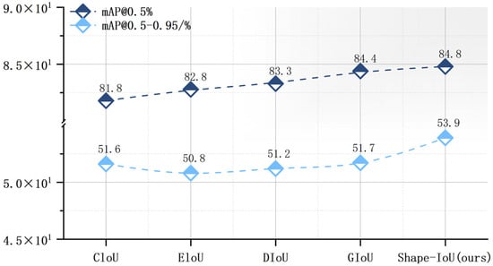 Regarding computational complexity (FLOPs/G) and some parameters (Params/M), Shape-IoU is consistent with other models at 8.1 G and 3.0 M. This means that Shape-IoU provides a significant increase in performance while maintaining the same computational burden as other models. Such performance advantages make Shape-IoU the preferred model for bearing defect identification tasks, especially in resource-constrained environments, which can achieve higher detection accuracy while maintaining low computational complexity.