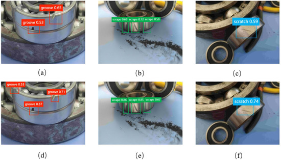 In this experiment, we compared the performance of the improved target detection algorithm and the original YOLOv8 algorithm on the bearing defect dataset. The resolution of the input image in the experiment is 640 × 640, and the confidence threshold is set at 0.25. Through qualitative analysis, we find that the improved algorithm is superior to YOLOv8 regarding detection accuracy and reliability. The comparison results between the enhanced algorithm and the YOLOv8n algorithm are shown in Figure 13, where (a), (b), and (c) represent the improvements of YOLOv8, and (d), (e), and (f) represent the improvements of YOLOv8-LMG.