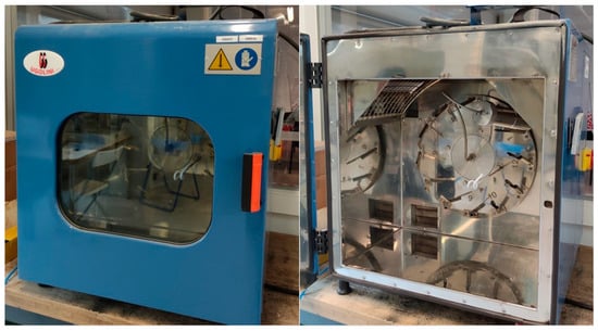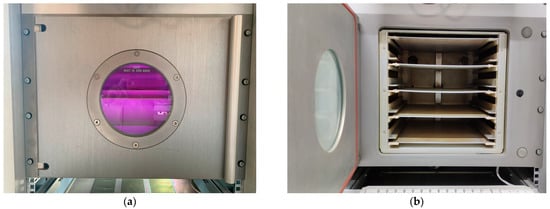 Plasma treatments of raw mycelium-based materials were performed with a low-pressure plasma (LPP) Tetra-30-LF-PV (Diener Electronic GmbH). The equipment is shown in Figure 2. It consists of a vacuum plasma system with a 37 L capacity and a discharge source that operates at a low frequency (40 kHz) and at maximum power of discharge of 1.0 kW. Four trays are symmetrically placed between five planar electrodes, which are also arranged inside the chamber at a constant distance and connected to the low-frequency generator. Plasma was generated by direct-current glow discharge in air, with a constant gas flow rate (20 sccm) and at a pressure of 30 mbar. The working power applied between the electrodes under these conditions creates the needed energy to produce plasma.