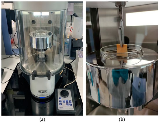 In order to evaluate the WCA and water absorption capacity properties of the mycelium, a Krüss K100 MK2 tensiometer was employed (see Figure 3), following the Washburn method, which is indicated for porous hydrophilic materials (WCA lower than 90°). In this model, WCA is measured by using the capillary forces previously measured and the following Equation (2) [13].