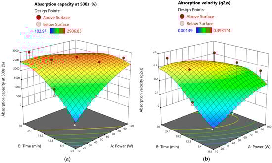 Surface response graphs after the study at different plasma conditions (time and power): (a) absorption capacity at 500 s, (b) absorption velocity. The red and pink dots correspond to the experiment design points, which obtained results are above and below the generated surface response, respectively.