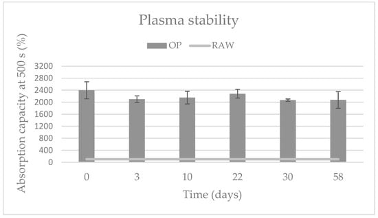 Absorption capacity (%) of plasma-treated mycelium material over time.