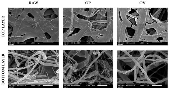 SEM images were captured for both faces of the mycelium, since it grows vertically from the substrate (mycelium biomass). In the case of the top layer, slight surface differences are observed with plasma treatments. Furthermore, the overtreated mycelium showed some surface degradation, and some modifications began to appear within the fibers of the material, especially on the top layer (Figure 8). These observations are in line with the results obtained for water absorption, since when the plasma treatment is too aggressive, the material can be damaged, and as a result, the water absorption is decreased or not further increased.