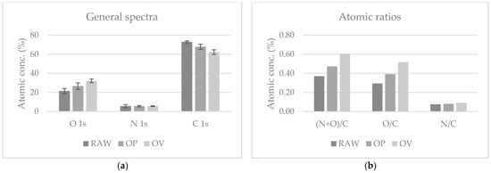 The spectra obtained from the XPS analysis of the 3 different references (RAW, OP, OV) are summarized in Appendix B (Figure A1, Figure A2 and Figure A3 respectively). The main peaks of each sample are O1s (~532 eV), N1s (~400 eV) and C1s (~285 eV), which corresponds to the expected elemental constitution for mycelium, whose structure is mainly made of chitin, chitosan, glucans and proteins. To more easily perceive the quantified differences between samples, the obtained atomic concentrations are represented in a bar chart (see Figure 9a). Numeric data are shown in Appendix A (Table A3). Nevertheless, other peaks are also present in the samples, such as Na, K, Mg, Ca, P and S, which can be attributed to contamination due to sample manipulation, or even Fe, Zn and Cr, which can be attributed to the sample holder, which was made of stainless steel.