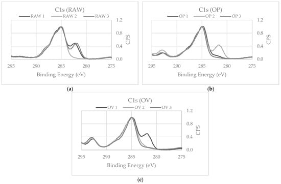 Additionally, the analysis of the C1s high-definition spectrum was also performed, for a qualitative interpretation. The spectra for the RAW, OP and OV samples are shown in Figure 10a, Figure 10b and Figure 10c, respectively, where the intensity (CPS, counts per second) has been normalized for facilitating the interpretation.