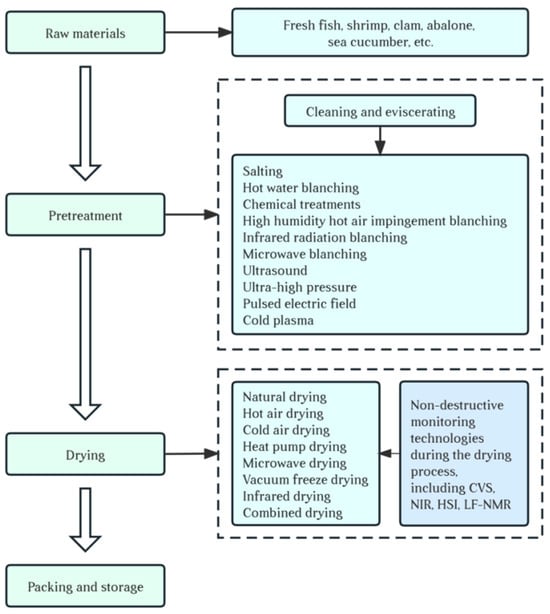 Figure 1 reveals the processing flow of aquatic products. The drying preprocessing techniques, drying technologies, and non-destructive monitoring techniques play an important role in achieving high-quality and -efficiency drying processes of aquatic products [5,6]. Drying preprocessing techniques treat materials by physical or chemical means to improve their drying efficiency and drying quality [6,7,8]. Recent studies have shown that the use of novel preprocessing techniques such as electric fields, ultrasound, and plasma largely solve the problems of traditional preprocessing techniques by changing the internal structure of materials, effectively retaining nutrients, and solving the food safety problems related to chemical residues [9,10], which has gradually become an important research direction in the field of aquatic product drying. Traditional drying and processing technologies, including natural drying and hot air drying, are commonly used because of their significant economic advantages, but they have low drying efficiency and poor drying quality. Therefore, high-quality drying technologies that combine efficiency and quality, such as cold air drying, heat pump drying, microwave drying, vacuum freeze drying, and infrared drying, have become the focus of research in the modern food processing industry. At the same time, combined drying technologies that utilize the advantages of various technologies have been developed to achieve higher drying efficiency, better drying quality, and lower costs. In recent years, many scholars have realized the real-time monitoring of the parameters of moisture, protein, lipid content, and other substances in the drying process through non-destructive monitoring techniques, including computer vision systems, near-infrared spectroscopy, hyperspectral imaging, and low-field nuclear magnetic resonance, which is of great significance for the precise control of drying effects and improvement of drying quality. In addition, studying and analyzing the effects of different drying processes on the sensory quality, nutrient content, and microbiological aspects of aquatic products is essential for obtaining high-quality drying processes.