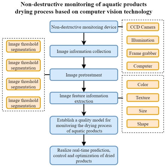 The fundamental principle of computer vision (CV) technology is to utilize visual sensors to acquire high-quality image signals of target objects and transmit the image information to a visual system to extract the target’s characteristic information. By analyzing and processing the feature information from different frames, the precise changes in the drying process of the product can be captured [77]. In the drying process of aquatic products, parameters such as color, dehydration status, and texture characteristics can be accurately reflected through images. Therefore, numerous studies have employed CV technology for monitoring the drying process of seafood products. The flow of non-destructive monitoring using CV technology in the drying process is shown in Figure 3. Mohebbi et al. [78] utilized a digital camera to measure the color characteristics in the RGB color space and converted them into the lab system to estimate the dehydration level of shrimp under different drying conditions. Moreover, they also established multiple linear regression and artificial neural network prediction models based on the correlation between shrimp moisture content and color features, with correlation coefficients of 0.80 and 0.86, respectively. To further achieve real-time detection of the drying process, Hosseinpour et al. [79] developed a CV system for continuous and online monitoring of color variations in shrimp during thin-layer drying, integrating it with a hot air dryer. The quadratic regression model established in this study accurately represented the relationship between sample color parameters and drying time, with an absolute coefficient of determination (R2) of 0.9659 and a mean square error (MSE) of 0.0016, demonstrating that the CV system can achieve the real-time prediction, control, and optimization of drying product quality attributes. Furthermore, Hosseinpour et al. [80] designed a novel image processing method to extract translation, rotation, and scale-invariant visual texture feature parameters during shrimp drying, enabling online monitoring and control of product quality.