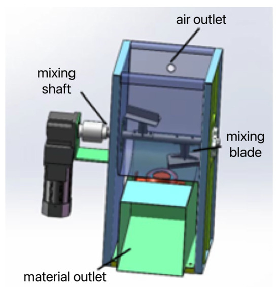 The experimental device used to explore the bio-drying effect of sludge consists of three parts: a reactor body, a ventilation and deodorization pipeline system, and an online control and monitoring system. The reactor box is a stainless-steel drying chamber composed of a 30 cm cube and a curved surface with a radius of 15 cm, with an effective volume of 40 L. The upper part is equipped with a square sampling port, from which sludge is discharged into the chamber. When conducting bio-drying experiments, the sampling port is closed. There is a circular sample outlet at the bottom, and the nut of the outlet can be loosened to clean the chamber after the experiment. The sludge is stirred by the stirring shaft and two stirring blades inside the chamber. The internal structure of the reaction box is provided in Figure 1.