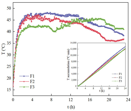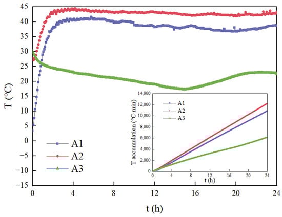 Using the cumulative temperature method [23], the data recorded by the temperature sensor are accumulated and calculated to compare the changes in material temperature in different systems. Linear fitting was performed on the cumulative temperature of materials in each system, and it was observed that the cumulative temperature curve of A3 group was significantly lower than that of A1 group and A2 group, indicating that thermal assistance can significantly increase system material temperature.