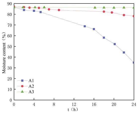 - During the bio-drying experiment, each group of experiments used a stirrer to continuously stir the materials, with a stirring frequency of 4.6 r/min and a ventilation rate of 1.58 L/(min·kg). During the experiment, samples were taken every 2 h to measure the moisture content, thermocouples were used to record the temperature changes in the stack every 5 min, humidity sensors were used to monitor the moisture content changes in the inlet and outlet air, and samples were taken every 2 h to measure the moisture content changes in the mixed materials.
