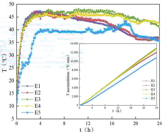 Under the same thermal auxiliary conditions, the material temperature was maintained within a relatively high range after adding a conditioner, which was conducive to the growth and proliferation of thermophilic bacteria. The overall temperature accumulation of the E1~E4 groups was not significantly different, while the temperature accumulation of the E5 group (10,850.6 °C·5 min) was significantly lower than that of the other four groups (12,041~13,041.2 °C·5 min), indicating that adding conditioners increased system temperature. Comparing the temperature accumulation of groups E1 to E4, it can be seen that rice husks and sawdust were more conducive to temperature maintenance.