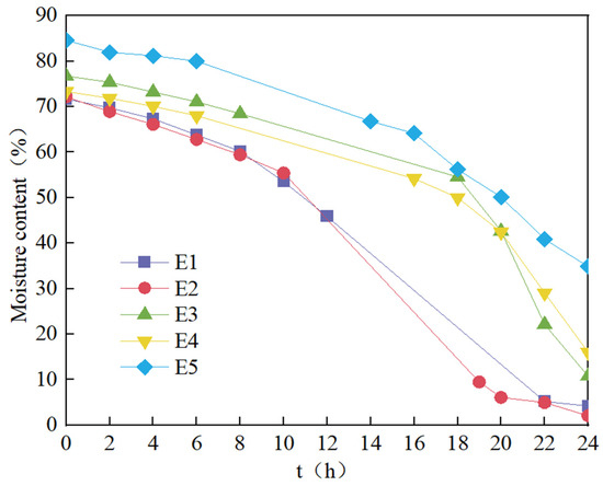The moisture content of the E3 group decreased from 76.73% to 10.78%, a decrease of 65.95%, while the E4 group decreased from 73.32% to 16.03%, a decrease of 57.29%. The moisture removal trend of these two groups was relatively consistent, with a slow removal stage from 0 to 18 h, with a 1% decrease in moisture content per hour, which was slower than the E1 and E2 groups; then, 18–24 h was the rapid removal stage, with a maximum hourly moisture content removal rate of 10% and an average hourly moisture content reduction of 7%. In the latter half of the stage, there was a greater potential for moisture removal.
