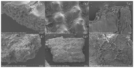 From Figure 6a–c, it can be observed that the arrangement of the internal structure of corncob is not very regular, with fewer complete pore structures, larger but fewer pores, and relatively fewer attachment points. Figure 6d–f indicate that the pore structure and adhesive sites of the corncob-sludge drying product are basically covered and masked, possibly due to the attachment of microorganisms to the surface of the corncob, resulting in the formation of a layer of reaction residue on the surface. The surface pores are partially penetrated, while some remain in a circular structure. It is speculated that the irregular structure of the corncob results in a lack of clear flow channels for airflow and water to migrate inside the material, resulting in perforation in weaker areas of the material.
