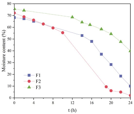 The water removal of F1 and F3 groups can be divided into two stages: slow and fast. The slow removal stage for the F1 group is 0–14 h, and the fast removal stage is 14 h later. The F3 group was limited by the sampling time, and it is difficult to determine the specific boundary points between the two stages. The removal rates of F1 and F2 in the slow water removal stage are 1.15%/h and 0.59%/h, respectively, and the removal rates in the fast water removal stage are 4.30%/h and 2.40%/h, respectively. The water removal of the F2 group can be divided into three stages: slow, fast, and second slow. Due to sampling time constraints, it is difficult to accurately determine the specific time nodes of the first two stages. The moisture removal rates in the slow and fast stages of F2 group are 1.67%/h and 4.93%/h, respectively. When the drying process reaches the 20th hour, the moisture content of the material decreases to 6%. At this point, the second slow removal stage is entered, and the moisture removal rate is 1%/h.