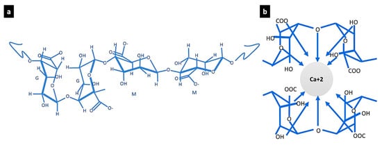 The chemical structure of alginate and its gelation by ionic cross-linking: (a) the chemical structure of alginate following [45] and (b) the egg-box model of the alginate ionic cross-linking by calcium ions following [18].