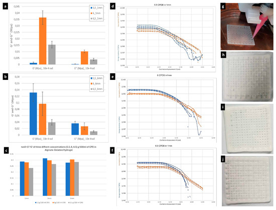 The rheological properties comparison between the three different hydrogels of different CPDB concentrations of 5.5, 6, and 6.5% enhanced SA–gelatine hydrogels in three different thicknesses of 1 mm, 3 mm, and 6 mm. (a) Comparison of the G values (G′ storage modulus) and G″ (loss modulus) between the three different 3D-printed hydrogels of 1 mm thickness; (b) comparison of G values between the three different 3D-printed hydrogels of 6 mm thickness; (c) a total comparison of the tan theta values of the three different hydrogels of different thicknesses of 1 mm, 3 mm, and 6 mm. (d–f) Each plot exhibits the G values (storage and loss modulus) in relation to the oscillation displacement of the tested three samples (ten replica per each): (d) the 5.5% CPDB rheological behavior, (e) the 6% CPDB properties, and (f) the 6.5% properties. Duplicate values obtained from overlapping in the ten replica behaviors per each sample were culled for easier reading. (g) The printability of the developed hydrogel of 6% CPDB-enhanced SA–gelatine hydrogel. (h,j) The 3D-printed hydrogel coherency and stability post printing and pre-third-stage cross-linking, where (h) corresponds to the 5.5% exhibiting swelling and low coherency; (i) the 6% exhibiting high coherency, layer-to-layer adhesion, and no swelling; and (j) the 6.5% showing minor swelling pre-cross-linking.