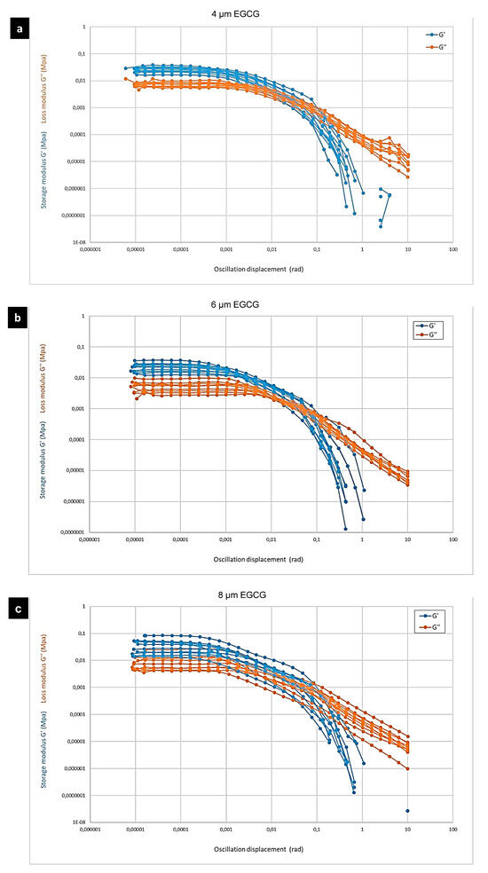 The rheological performance of the three tested EGCG-modified hydrogels using different concentrations of (4, 6, and 8 µm). Each plot exhibits the G values (storage and loss modulus) in relation to the oscillation displacement of the tested three samples (ten replicas each): (a) the 4 µm EGCG-modified hydrogel rheological behavior, (b) the 6 µm EGCG-modified hydrogel properties, and (c) is the 8 µm EGCG-modified hydrogel properties.