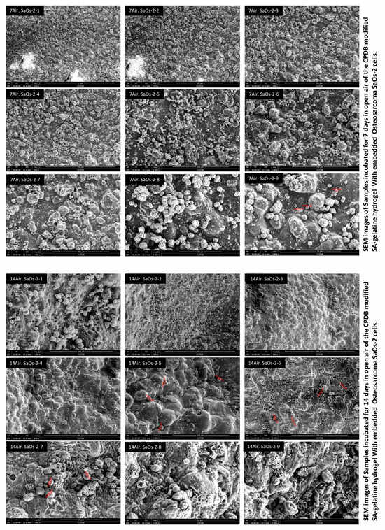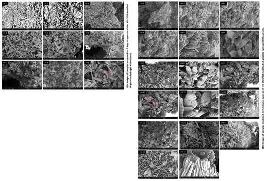 In the design of the experimental procedures in this phase, we chose incubation in FBS and air, respectively, due to the following reasons; (1) Fetal bovine serum (FBS) is a common media constituent used in tissue engineering cultures [140] thanks to its nourishing composition containing proteins and growth factors, allowing maintenance and proliferation of eukaryote cells in vitro It has proven to maintain and boost the growth of different type of cells, which justifies its standard use in cell culture and tissue engineering protocols [141]. Although in the current phase of the experimental study, the optimized hydrogel does not contain any embedded osteosarcoma cells as planned, the use of FBS for incubating the hydrogel was intended not only to standardize the experimental study procedures by providing a control group where the hydrogel is incubated in FBS without embedding cells but also to test the effect of the FBS as a standard simulation of body fluids [142,143] on the degradation rate and mineralization behavior of the optimized hydrogel in the current study. (2) Incubation in open-air, non-sterile conditions is considered the pivotal point of novelty in the current study since it has not been reported in the previous literature before, especially for the novel proposed application in the current study as a structural building material, to our knowledge. The standard tissue engineering practices have always focused on in vivo testing of the developed hydrogels scaffolds, which necessitates their sterilization. This is not the case in the current study, which takes a different approach to prove that under non-sterile conditions, the incubated, optimized hydrogel exhibits high antimicrobial properties, as exhibited in Figure 4, which shows the SEM results of the incubated, optimized hydrogel in open-air, non-sterile conditions.