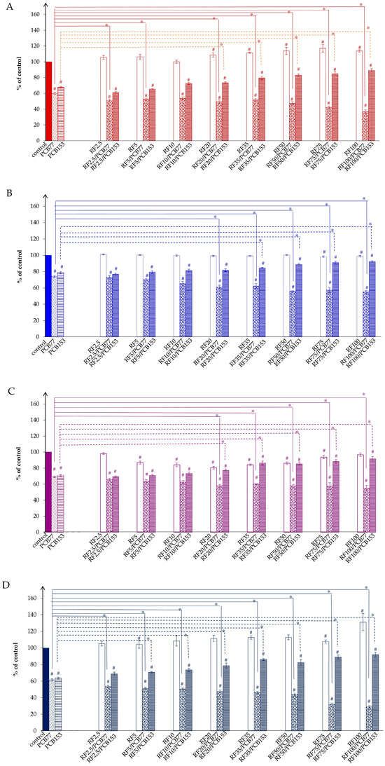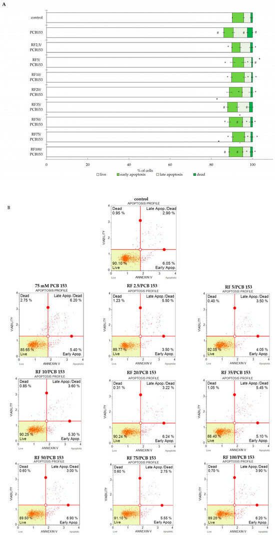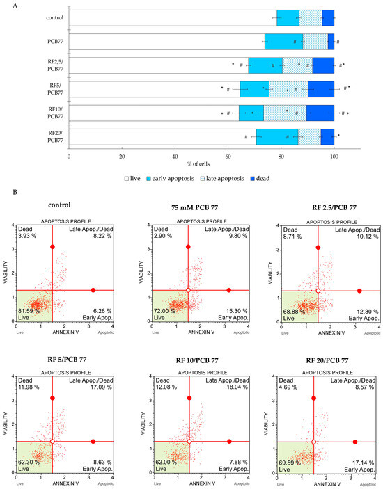 In order to determine the number of live, apoptotic, and necrotic cells after 24 h pre-incubation with RF and treatment with different PCB congeners, the Muse™ Annexin V & Dead Cell Kit was used in accordance with the manufacturer’s protocol. An experimental procedure was set up for cell viability and proliferation analysis. In order to perform analysis using the Muse™ Cell Analyzer (Merck, Billerica, MA, USA), 100 µL aliquots of trypsinized cell suspension and 100 µL of Muse™ Annexin V & Dead Cell Reagent were mixed and incubated for 20 min in the dark at room temperature. Each RF concentration was tested in up to 7 replicates.