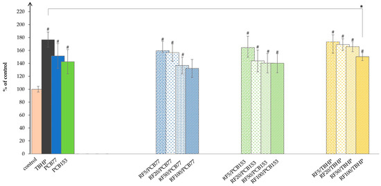 Effect of pre-incubation with novel ferrocene-containing triacyl derivative of resveratrol (RF5–RF100) at concentrations of 5–100 µM on the formation of reactive oxygen species (ROS) in CHO-K1 cells treated with either 75 μM PCB 77 or PCB 153. Control sample—cells treated with 15 μL DMSO mL−1; positive control sample—cells treated with 50 µM tert-butyl hydroperoxide (TBHP). Results are expressed as a percentage of control ± SEM. Statistically significant differences (Student’s t-test): # p < 0.05 compared to control; * p < 0.05 compared RF + TBHP vs. TBHP.