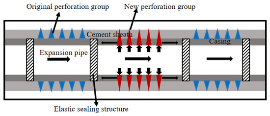 Addressing the issue of uncontrollable fracturing fluid flow direction caused by chemical temporary plugging agents in refracturing operations, Enventure GT has developed an expandable liner wellbore-reconditioning tool for refracturing [35]. After inserting the expandable liner into the desired location for sealing, high-pressure fluid is pumped through the wellhead to move the expansion cone and inflate the liner. The outer sealing device of the liner is set on the casing to form mechanical isolation and sealing. The old production zone and the original perforation cluster are isolated by the outer sealing mechanism, ensuring internal pressure integrity of the wellbore [36]. This is shown in Figure 4.