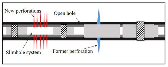 “Packers Plus Energy Services” has developed the Slimhole refracturing technology [38]. This technology involves inserting a liner into the existing wellbore and combining it with packers and sliding sleeves for refracturing operations. It is suitable for both open-hole and cased-hole completions, as shown in Figure 5 and Figure 6.