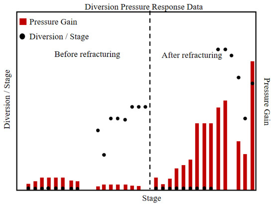 Generally speaking, as the construction progresses, the construction pressure and instantaneous pump shutdown pressure gradually increase, indicating that the fracture is constantly diverting and that new modification areas are being added. However, some scholars believe that, even if the construction pressure gradually increases, it does not necessarily indicate that the refracturing has diverted into new areas. For example, in a shale gas well in the Woodford block, the construction pressure gradually increased, but there was basically no increase in the post-fracturing production [30]. Agharazi et al. [41] argue that, in the presence of many perforated clusters, it is difficult for refracturing to generate new fractures. As gas continues to be produced after the initial fracturing, Mohr’s circle of formation rocks shifts to the right, increasing the effective stress acting on the weak planes of the rocks, thus making it more difficult to generate new fractures.