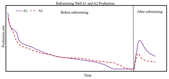 - Before the infill well is drilled but not yet fractured, the mother well should be refractured first to restore the formation pressure around the mother well, and then the infill well should be fractured to reduce the phenomenon of the asymmetric expansion of the infill well fracture to the side of the mother well due to the pressure shortfall of the mother well, which can not only increase the output of the infill well but also protect the output of the mother well [13].