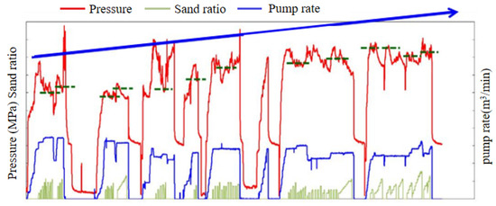The temporary plugging and refracturing process is commonly used in foreign shale gas wells. Generally speaking, the process is performed in stages on-site. Temporary plugging balls or agents are added to distinguish between different stages, allowing different stages to target different cluster locations. A typical generalized temporary plugging and refracturing operation consists of the following stages: pre-pad fluid pressurization stage, temporary plugging agent injection stage, refracturing stage, and re-injection of temporary plugging agent stage. The injection of pre-pad fluid can supplement the formation energy, increase the formation pressure in low-pressure areas, and avoid the extension of fractures entirely in low-pressure regions. Due to the low density of temporary plugging agents, pump discharge rates need to be controlled during the injection stage to prevent the agents from being pumped into the deep parts of the fractures. On the one hand, this can avoid temporary plugging agents from being pumped into the deep parts of the fractures; on the other hand, the reduced discharge rate can decrease the fracture width, facilitating the bridging and sealing of different particle sizes of temporary plugging agents within the fractures [40].